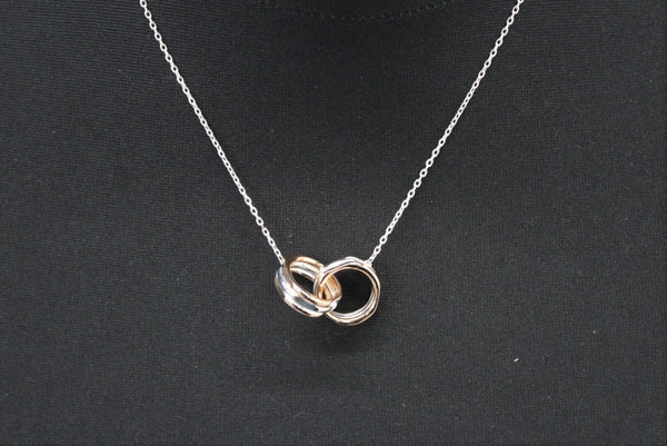 This is a listing for a ladies two tone interlock ring necklace from Links of London. It features an elegant fine link sterling silver chain with two interlocking rings in stunning rose gold vermeil and silver. The perfect accessory for any occasion.